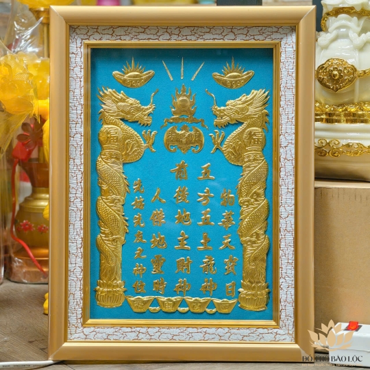 Bài Vị Thần Tài Thổ Địa Dát Vàng Khung Gỗ Sơn Vàng Nền Xanh 2 cỡ: 25cm x 35cm và 30cm x 40cm