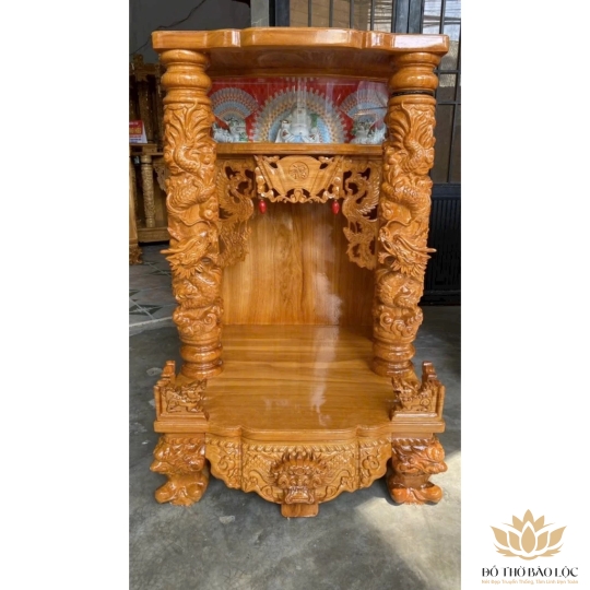 Bàn thờ thần tài ông địa gỗ đỏ Ngang 80cm x cao 107cm quỳ trụ - hộp đèn