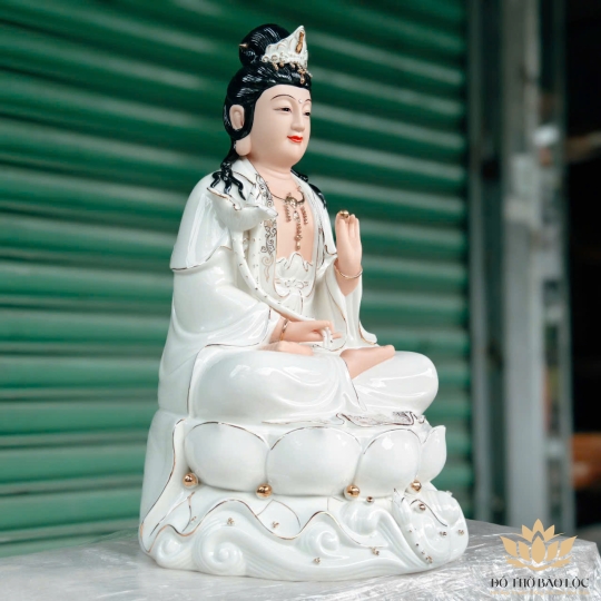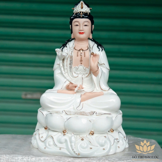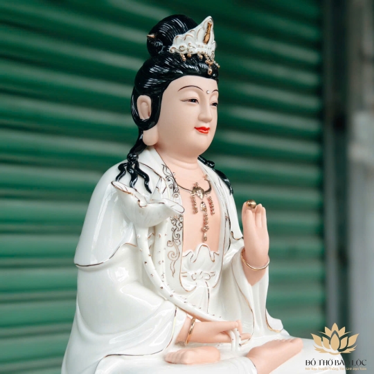 Tượng được chế tác từ sứ Đức hóa cao cấp – một loại sứ nổi tiếng với độ trắng mịn, độ bền cao và nước men bóng sang trọng. Chất liệu sứ được nung ở nhiệt độ cao, cho màu men sáng đều, bền màu theo thời gian và đặc biệt an toàn, không độc hại. Đường nét chạm khắc tinh xảo kết hợp với sắc men trang nhã đã tôn lên vẻ uy nghiêm và thanh tịnh của Bồ Tát, phù hợp để thờ cúng trong không gian linh thiêng tại gia, chùa chiền hay phòng thiền.