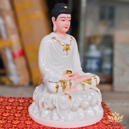 Tượng Phật Thích Ca Mâu Ni được chế tác tinh tế từ sứ trắng cao cấp, mang lại cảm giác thanh tịnh và trang nghiêm. Ngài ngồi kiết già trên đài sen, tay kết ấn thiền định (Định ấn) – biểu hiện cho tâm an tĩnh, sự nhập định sâu sắc và trí tuệ giác ngộ.