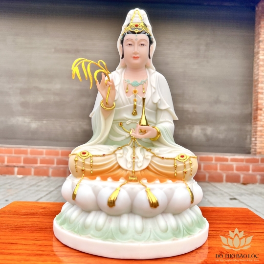 •    Tượng Quan Thế Âm ngồi trên đài sen. Màu sắc nổi bật cùng với các chi tiết đường nét, hoa văn được thiết kế tỷ mỷ và tinh xảo.