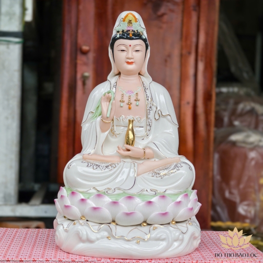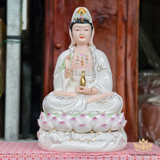 Tượng Quan Âm Bồ Tát được chế tác từ chất liệu sứ cao cấp, phủ men trắng tinh khiết, tạo nên nét đẹp thanh thoát và trang nghiêm. Ngài ngồi trên tòa sen hồng – biểu tượng của sự thanh tịnh, vượt lên trên phiền não trần thế. Trên tay Ngài cầm bình cam lồ vàng rót nước từ bi, tay còn lại kết ấn ban phúc lành, thể hiện tâm nguyện cứu độ muôn loài.