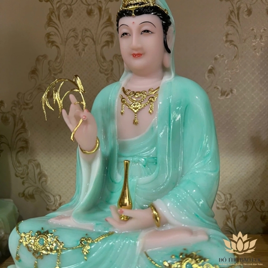 - Đức Quán Thế Âm ngồi kiết già trên đài sen, tay trái cầm bình nước cam lồ, tay phải cầm lá liễu.