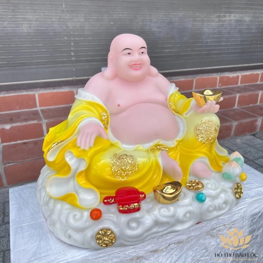 [14inch] Tượng phật Di Lặc cầm thỏi vàng bằng đá Việt Nam ngang 35cm – màu vàng