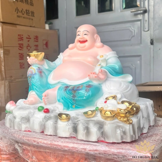 [16inch] Tượng Phật Di Lặc cầm gậy như ý ngang 38cm đá nhập khẩu màu Xanh Gấm
