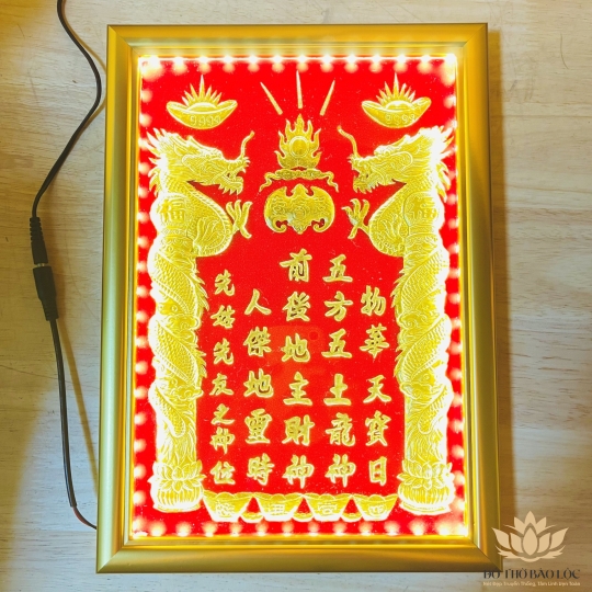 [23x30] Bài Vị Thần Tài Thổ Địa Dát Vàng Khung Gỗ Vàng Nền Đỏ Cao 30cm x Ngang 23cm - Có đèn