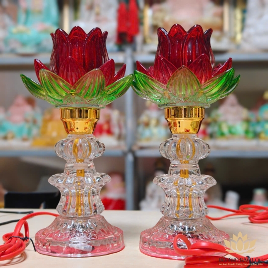 Cặp Đèn Thờ Pha Lê Hoa Sen Thủy Tinh cao cấp, đèn led 7 màu cao 25cm– hoa sen vàng và đỏ