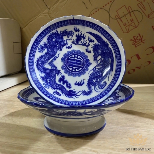 Đĩa sứ thờ họa tiết long phụng bằng gốm Bát Tràng – Đường kính: 24.5cm
