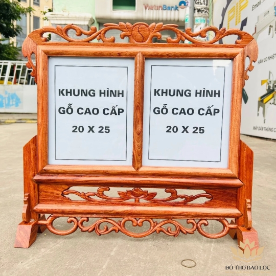 Khung ảnh đôi thờ gia tiên 20cmx25cm gỗ hương chạm khắc ép kính viền hoa cao cấp cao để vừa hình