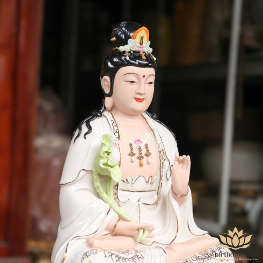 Tượng Bồ Tát Đại Thế Chí được chế tác tinh xảo bằng sứ cao cấp, phủ men trắng bóng mịn, tôn lên vẻ từ bi và trang nghiêm của Ngài. Ngài ngồi trên đài sen hồng thanh tịnh, tay cầm cành hoa sen biểu tượng của trí tuệ sáng suốt, ánh mắt hiền hòa mang năng lượng cứu khổ độ sinh.