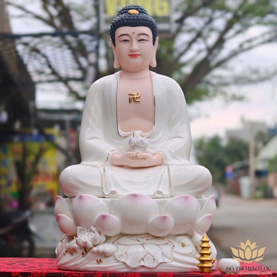 Tượng Phật A Di Đà Bằng Sứ Đức Hóa sen hồng 2 Kích Cỡ Cao (31cm và 41cm) màu trắng