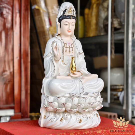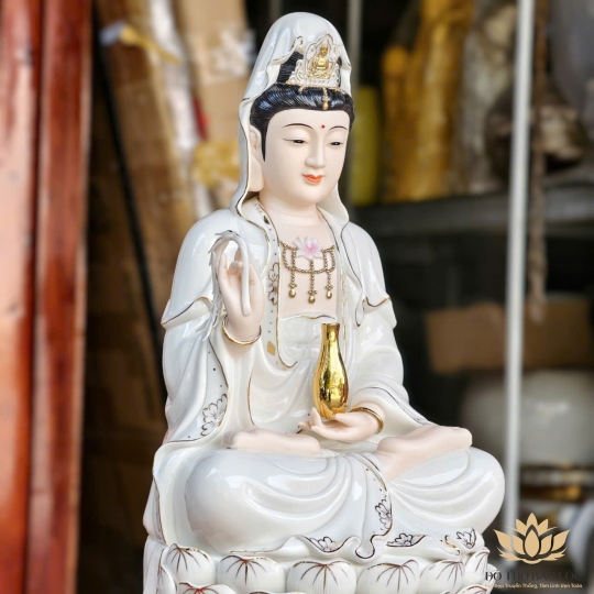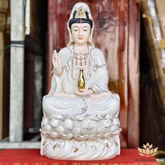 Tượng được làm từ sứ cao cấp, men bóng mịn, thể hiện hình ảnh Quan Âm Bồ Tát ngồi kiết già trên đài sen, tay cầm tịnh bình cam lộ – biểu trưng cho lòng từ bi và năng lực cứu khổ độ sinh. Gương mặt hiền hòa, ánh mắt từ ái, đường nét tinh xảo, màu sắc trang nhã. Phù hợp thờ tại bàn thờ Phật gia đình hoặc không gian tu tập.