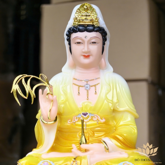 Tôn tượng Quan Thế Âm tọa trên đài sen ngát tỏa, nổi bật bởi những hoa văn được chạm khắc tỷ mỷ, minh chứng cho lòng từ bi vô lượng và sự bảo hộ bình an. Mang gương mặt hiền hậu của người mẹ hiền, Ngài đại diện cho tình mẫu tử thiêng liêng, luôn lắng nghe và xoa dịu nỗi đau nhân gian. Màu sắc vàng của đá không chỉ tôn lên vẻ trang nghiêm mà còn mang ý nghĩa chiêu tài, tiến bảo, giúp không gian thờ tự thêm phần vượng khí.