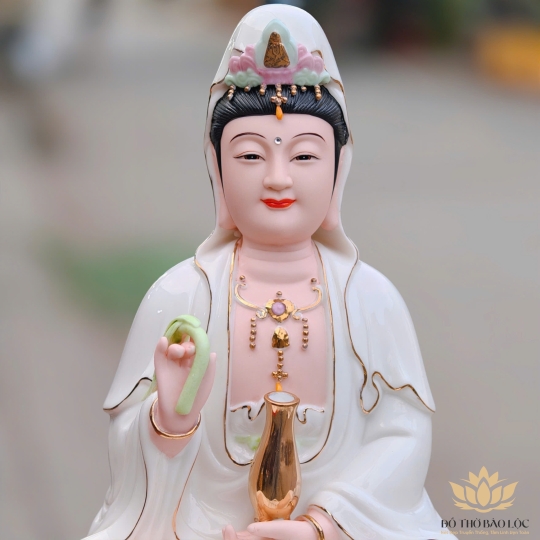 Tượng Quan Âm Bồ Tát được chế tác từ chất liệu sứ đức hóa, tạo nên nét đẹp thanh thoát và trang nghiêm. Ngài ngồi trên tòa sen hồng – biểu tượng của sự thanh tịnh, vượt lên trên phiền não trần thế. Trên tay Ngài cầm bình cam lồ vàng rót nước từ bi, tay còn lại kết ấn ban phúc lành, thể hiện tâm nguyện cứu độ muôn loài.